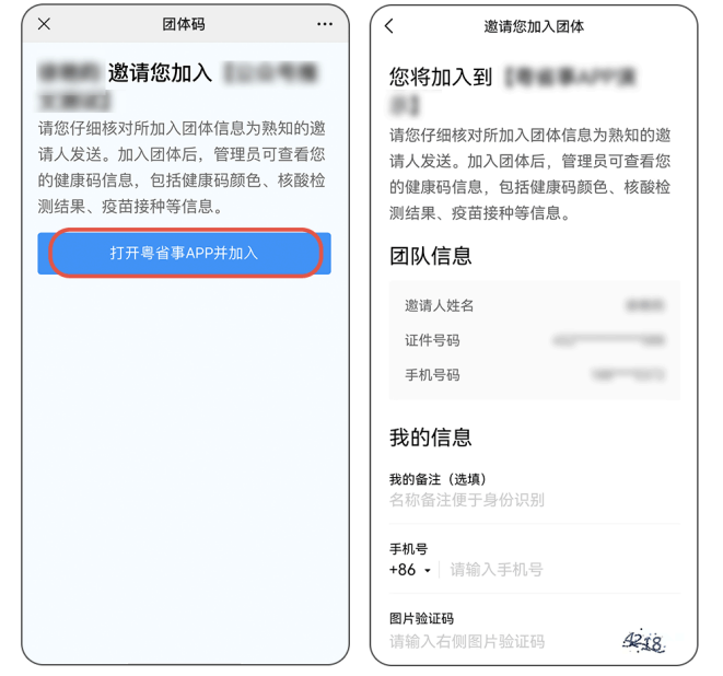 成员通过点击邀请链接或扫描图片二维码的方式进入加入团体页面,点击“打开粤省事APP并加入”。进入授权页面后填写个人信息及验证码,勾选同意健康声明,点击“授权并加入团体”,完成加入团体。