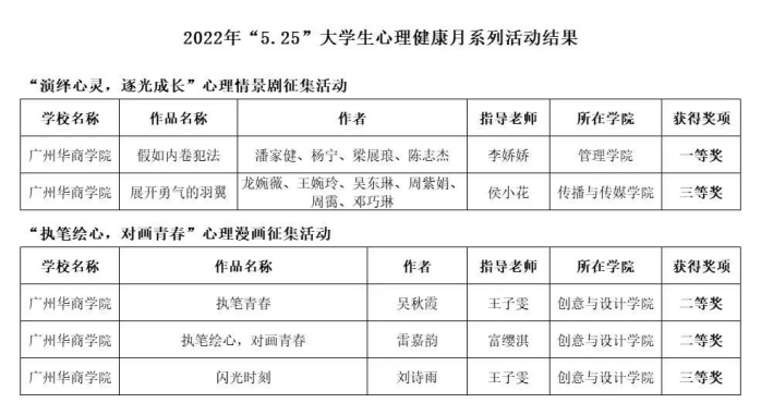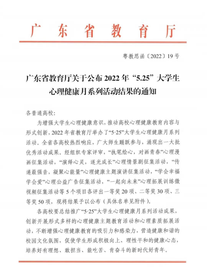 为增强大学生心理健康意识,推动高校心理健康教育内容与形式创新,提高大学生心理素质,广东省教育厅举办了“5.25”大学生心理健康月系列活动,活动涵盖心理漫画、心理情景剧、心理健康主题演讲、心理公益广告、心理拓展训练微视频等内容。