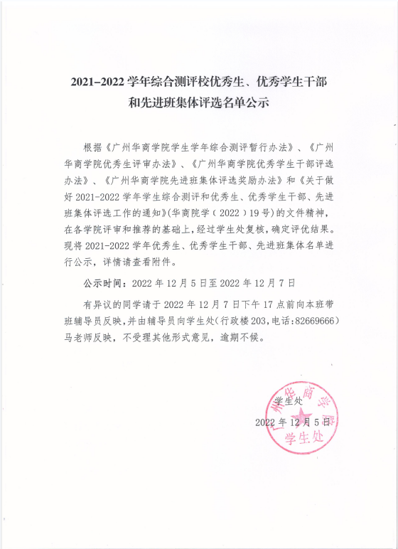 2021-2022学年综合测评校优秀生、优秀学生干部、和先进班集体评选名单公示