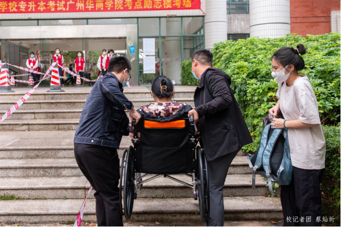 特别是看到一位行动不便坐着轮椅的考生时,志愿者和老师赶忙走上前去帮助她。根据她提供的考场信息,志愿者们一路护送该考生到达考场,还给了她很多鼓励和暖心的祝福。