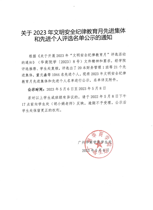 关于2023年文明安全记录教育月先进集体和先进个人评选名单公示的通知