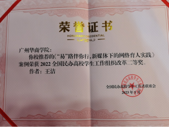 王洁老师的案例《“易”路伴你行,新媒体下的网络人实践》荣获2022全国民办高校学生工作组织改革二等奖。