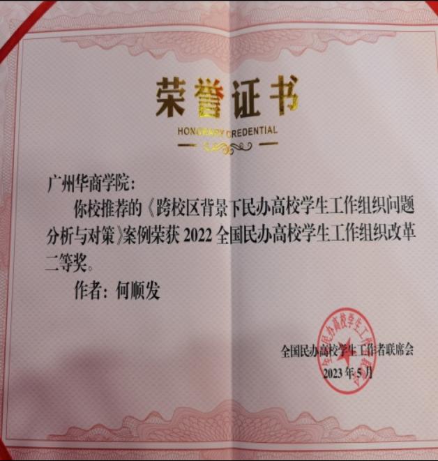 何顺发老师的案例《跨校区背景下民办高校学生工作组织问题分析与对策》荣获2022全国民办高校学生工作组织改革二等奖。
