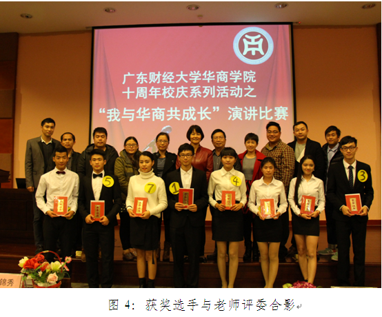12月15日下午,国际会议中心四楼报告厅内座无虚席,由广东财经大学华商学院学生处和校庆办联合举办的十周年校庆系列活动之“我与华商共成长”演讲比赛在此隆重举行。来自各二级学院、系部的8位选手参加了比赛。学院王锦秀副院长、学生处刘德平处长,学学生处黄国富副处长,学院办公室吕书勉副主任、各二级学院、系的学工负责人和学生组织代表担任此次比赛评委。