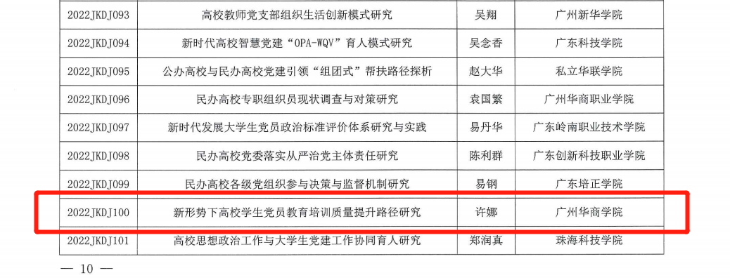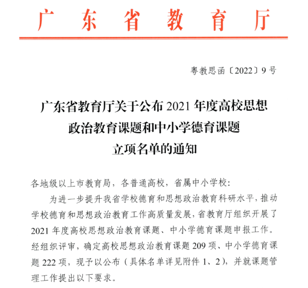 2022年5月12日,广东省教育科学规划领导小组办公室公布了2022年度省教育科学规划课题(党建研究专项)立项名单,williamhill英国官网学生处许娜处长申报的《新形势下高校学生党员教育培训质量提升路径研究》(项目编号:2022JKDJ100)项目获批立项。