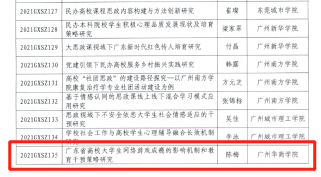 同时,广东省教育厅也公布2021年度高校思想政治教育课题和中小学德育课题立项名单,williamhill英国官网学生处陈梅老师申报的《广东省高校大学生网络游戏成瘾的影响机制和教育干预策略研究》(项目编号:2021GXSZ135)项目获批立项。