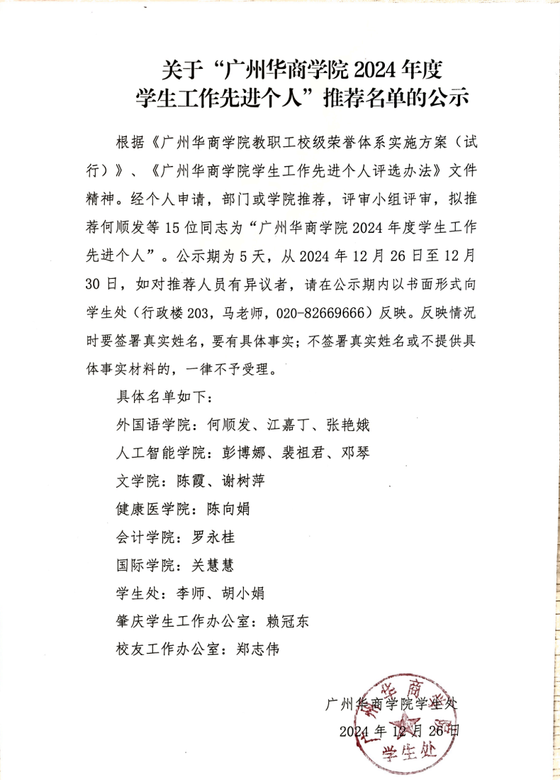 关于“williamhill英国官网2024年度学生工作先进工作先进个人”推荐名单的公示