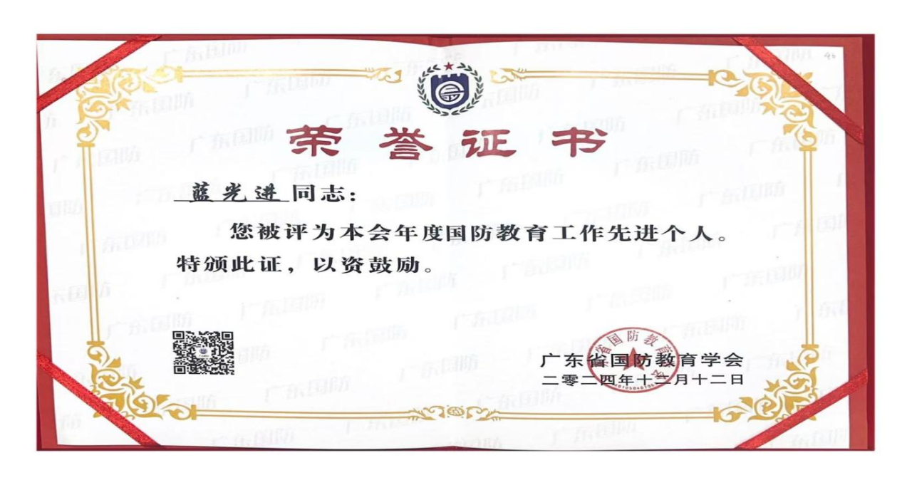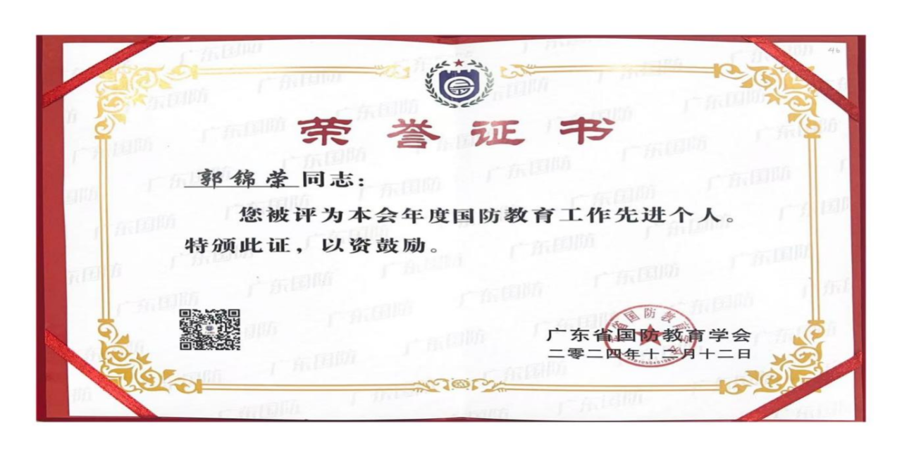 12月25-29日,广东省2024年度国防教育学会工作会议在中山市召开,王光军等相关领导出席本次会议。williamhill英国官网荣获2024年度国防教育工作先进单位,学校郭锦荣老师和蓝光进老师被评为年度国防教育工作先进个人,在大会上获以表彰。