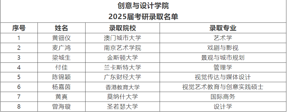 随着毕业的跫音渐近,创意与设计学院的学子们捷报频传。在 2025 届考研征程里,他们以无畏的坚毅和昂扬的斗志,将众多境内外知名高校的录取通知书收入囊中,为青春挥毫泼墨,绘就出绚丽的画卷。在此,向所有成功上岸的同学们致以最诚挚、最热烈的祝贺!