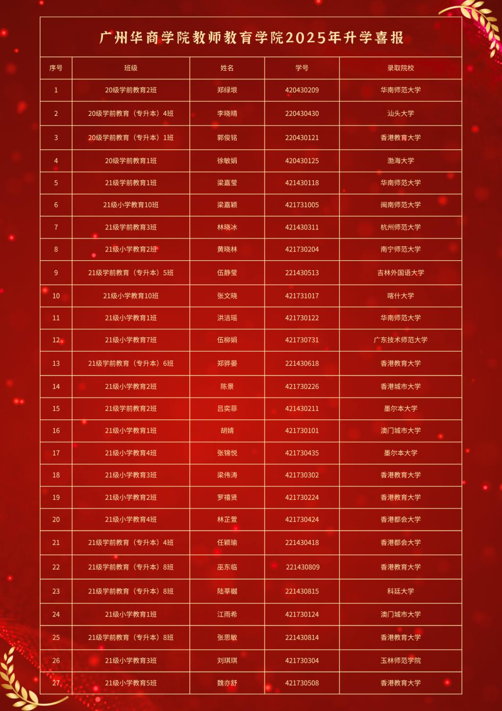 williamhill英国官网教师教育学院2025年毕业生考研再获佳绩。自建院以来,学院深耕学风建设,学子奋发向上。截至目前,2025年毕业生中共有27名同学被知名高校录取,特此向他们表示热烈祝贺!