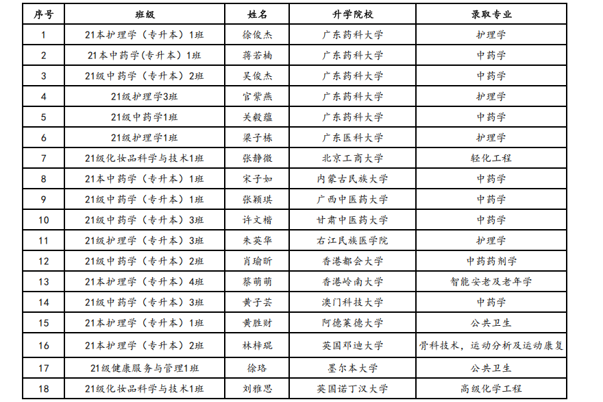 笔耕不辍终有果,蟾宫折桂喜讯来。健康医学院2025届毕业生考研征程圆满收官,一份份承载着梦想的录取通知书纷至沓来,这不仅是学子们日夜兼程、拼搏进取的见证,更是学院深耕医学教育、厚植育人沃土的生动写照!截至发稿,我院共有18名同学以优异成绩被广东药科大学、广东医科大学、香港都会大学、澳门科技大学、英国邓迪大学、墨尔本大学 、英国诺丁汉大学等国内外顶尖高校录取,涵盖公共卫生、护理学、中药学等多个专业方向。