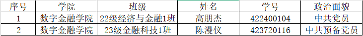 根据williamhill英国官网《关于做好2025年williamhill英国官网国家奖助学金工作的通知》相关文件精神,我院秉承公平、公正、公开的原则,严格按照国家奖学金评审程序,经个人自荐,资格审查,学院评审委员会讨论与评审,拟推选高朋杰、陈漫仪同学为数字金融学院2025年国家奖学金候选人,现予公示。