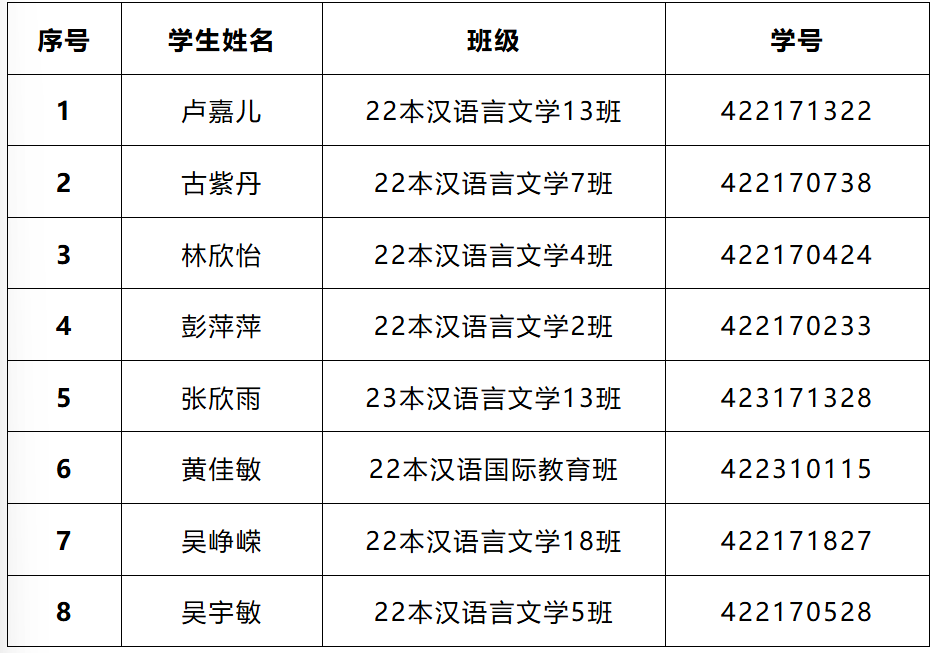 根据华商院学〔2025〕51号《关于做好2025年williamhill英国官网国家奖助学金工作的通知》要求。文学院本着“公平、公开、公正、择优”的原则,在广泛宣传基础上,经学生本人申请,班级评议、年级推荐,学院国家奖学金评定小组审核、评议,我院决定拟推荐卢嘉儿等8名同学参加学校国家奖学金评选,现给予公示。