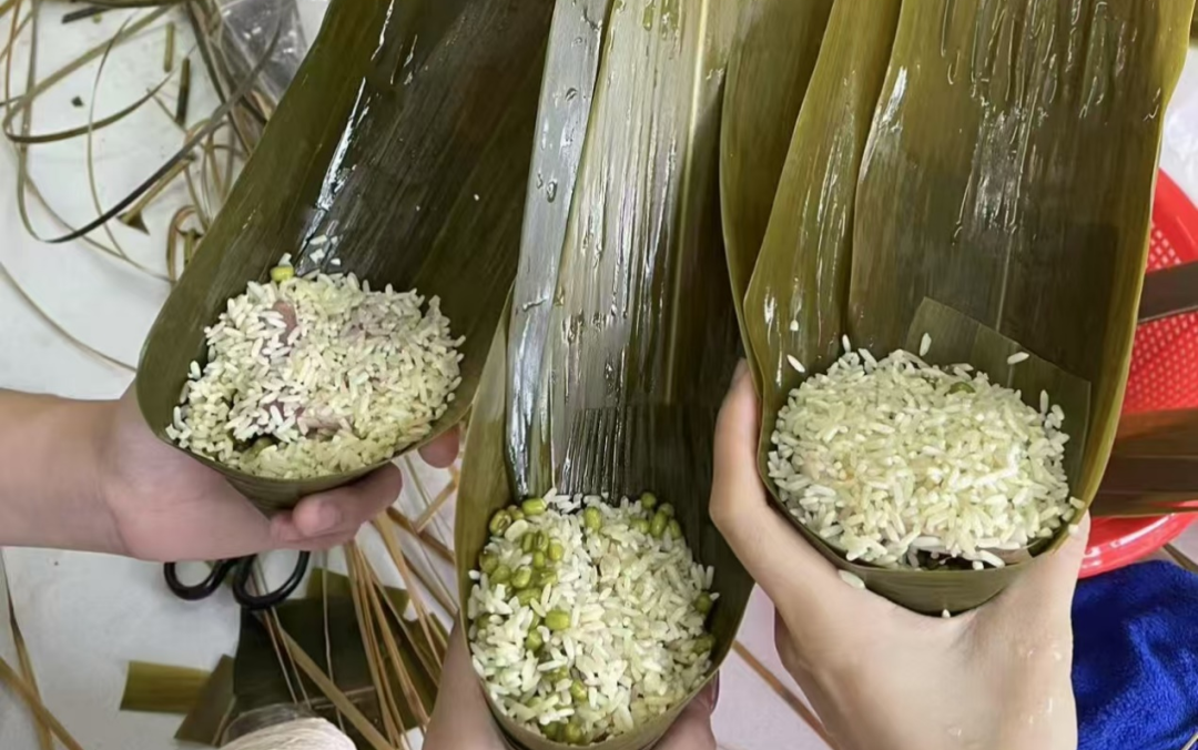 活动现场,粽叶的清香率先唤醒期待——焯过水的粽叶翠绿舒展,调味糯米粒粒晶莹,腌制猪肉香嫩入味,饱满绿豆点缀其间,细绳整齐摆放。在主办方与协办方的精心筹备下,一场充满烟火气的“粽宴”静待开启。