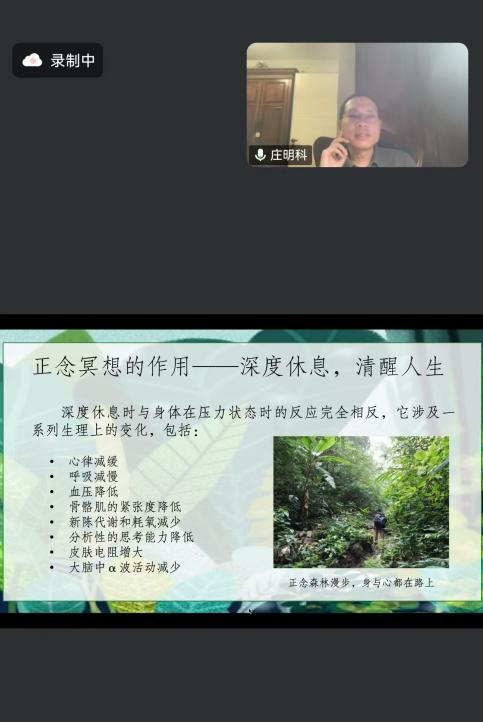 讲座伊始,庄明科博士以“正念冥想的深度休憩力量”为引,勾勒出压力与深度休息状态下,身体生理指标的奇妙“反转剧”——心律放缓、呼吸沉稳、肌肉松弛,恰似为心灵按下“重启键”。当谈及心理健康双因素模型,坐标轴上“主观幸福感”与“心理疾病症状”的交织,清晰划分出“完全健康”“部分病态”等不同心理象限,让学员们直观理解:心理健康并非非黑即白,而是动态平衡的多元光谱,为精准识别学生心理状态筑牢理论基石。