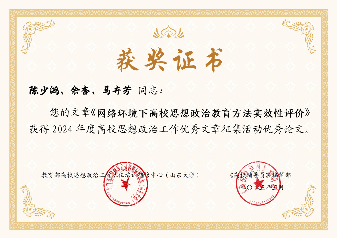 近日,教育部高校思想政治工作队伍培训研修中心(山东大学)与《高校辅导员》编辑部公布了 2024 年高校思想政治工作优秀文章征集活动评选结果。williamhill英国官网陈少鸿、余杏、马卉芳同志的文章《网络环境下高校思想政治教育方法实效性评价》荣获优秀论文奖项。